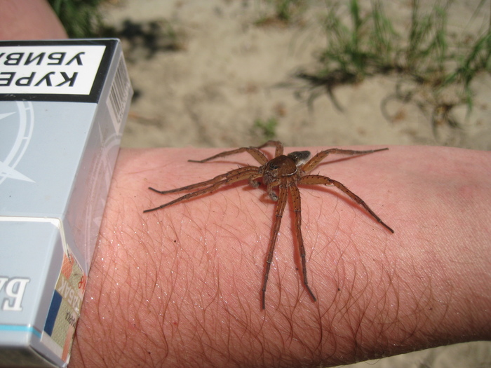 Первая мысль в похмельном мозгу была: «Ну, все, пипец, допился. Белочка в отпуске или отгуле и, в наказание, мне прислали вот это… восьмилапое…» Со второй мыслью пришло больше конкретики: «Спасайся, кто может»! Я истошно бултыхнулся, как тюлень со льдины. Поднявшейся волной восьмилапового выбросило на берег. Подскочив, как ошпаренный на раскаленном песке, он сделал несколько прыжков и влетел на мою левую руку. Новое падение в воду. Привлеченная моим акробатическим этюдом, над краем берега показалась жена. Она с интересом наблюдала, как я, словно мокрый щенок, истошно карабкался по осыпающемуся песчаному склону. Выбрался. Поднял правую руку и… встретил внимательный взгляд. Восьмилапый уверенно «держался в седле». Я занес над ним подрагивающие пальцы. Он поднял в ответ две передние лапы, четко обозначив, что фамильярностей не потерпит. «Ладно, сдаюсь», - сказал я вслух, - «только без членовредительства…» Жена с безопасного расстояния что-то буркнула про уровень моего умственного развития. Приблизившись, она сразу же окрестила восьмилапового «Петенькой» и твердо заявила, что если у кого-нибудь из нас возникнет мысль познакомить его с ней поближе, то нам обоим на месте придет трындец, посредством лопаты «Фискарс». После этого супруга удалилась за фотоаппаратом и пачкой сигарет, для масштаба. А мы с «Петенькой» продолжили изучать друг друга. Честное слово, я ни разу в жизни не встречал в наших краях такого здоровенного арахнида. Слышал, что на границе с Казахстаном есть тарантулы, но чтоб на 100 верст севернее у реки жило такое...