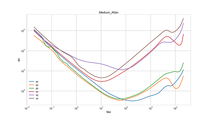 Как будем делать? Да очень просто. Вариация Аллана используется для оценки стабильности измерений генераторов. Например, можно оценить погрешности для работы часов. Стоп, а причем тут тогда твои сенсоры? Дело в том, что если положить сенсоры и не трогать их, то в идеале все 6 осей должны выдавать одинаковые значения (так конечно не будет в реальности). Например, для осей гироскопа это должны быть нули, а для акселерометра - проекция на вектор силы тяжести. Так же сама оценка очень наглядно показывает уровень погрешности во времени. Примерно так.