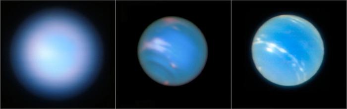 Слева-направо: снимок Нептуна 8,2-метровым телескопом VLT без адаптивной оптики, снимок 2,4-метрового космического телескопа «Хаббл», снимок телескопа VLT с адаптивной оптикой.