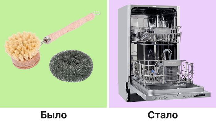 Для мытья посуды специальных девайсов не было. Все делалось руками с «насадками» для них: ветошами, щетками, металлическими губками для особых случаев. Машиной себя мог почувствовать каждый, особенно тот, кто помыл всю посуду после прихода гостей.