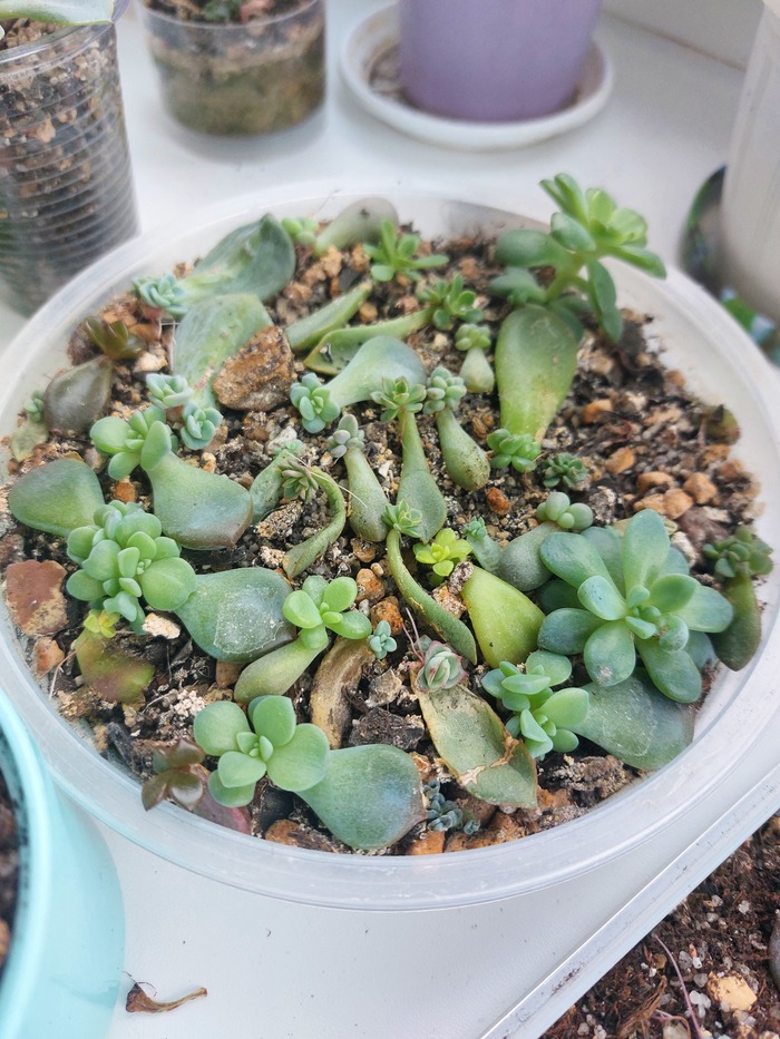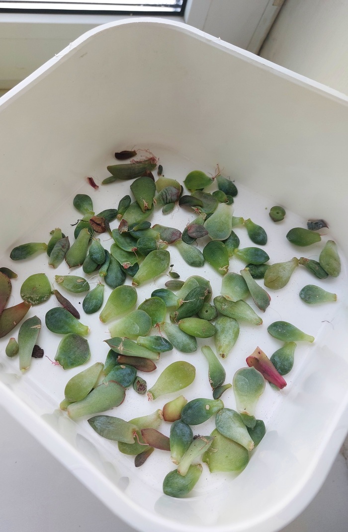 Листья суккулентов, которые отвалились при пересадках и пересылках, я складываю в пластиковый контейнер: