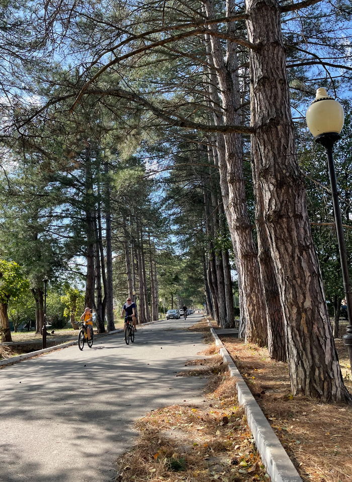 Пройдя весь путь, мы вышли к месту под названием санаторий Горячий ключ. Колоритное место с кафе и различными местами для отдыха, детскими развлечениями и множеством скамеек.