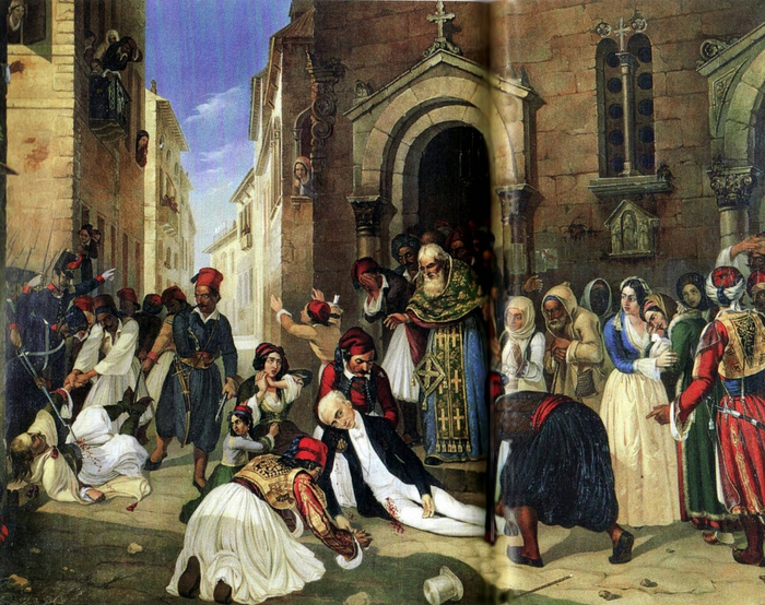 Проснувшись рано утром, бывший министр иностранных дел России, граф и первый правитель независимой Греции Иоанн Каподистрия спешил на праздничную службу в храм Святого Спиридония. Обычай проводить божественную службу с восходом солнца остался у греков еще со времен османского владычества - так те надеялись избежать столкновений с турками, однако сохранился и после обретения страной независимости. В тот роковой день, 27 сентября 1831 года, в храме было уже довольно много народу, среди которых - Георгиос и Константинос Мавромихалис, также пришедшие воздать молитву Господу, после чего покинули церковь, остановившись у ее входа - соответственно, по левую и правую стороны от дверей. Совсем скоро во дворе храма показался сам Каподистрия, завидев которого, толпа прихожан вежливо расступалась. В этой толпе правитель Греции заметил двух своих давних знакомых, после чего, приподняв шляпу, поприветствовал Мавромихалисов. Константин, приподняв свою феску, ответил на поклон, когда же президент республики повернулся к Георгию, его дядя (Константинос) распахнул свой плащ и не глядя выстрелил в народного избранника. Видя, что пуля не достигла своей цели, заговорщик выхватил нож и вонзил его графу в низ живота по самую рукоять, после чего прогремел очередной выстрел - на сей раз он принадлежал Георгию. Пуля, выпущенная в голову графа, достигла черепа, который от столкновения с металлом разлетелся на части. Стоит ли говорить, что от полученных травм Иоанн Каподистрия скончался на месте, а вместе с ним умерла надежда греков на собственную судьбу.
