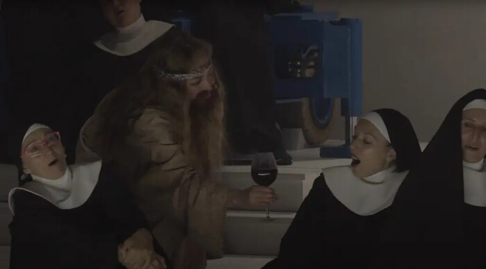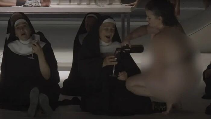 Как пишет Daily Mail, актриса, играющая Иисуса, «отшлепывает» обнаженную женщину. А в особенно напряженной сцене тела актеров навешиваются на стену, имитируя Христа на кресте, после чего на них начинают литься чаны с поддельной кровью.
