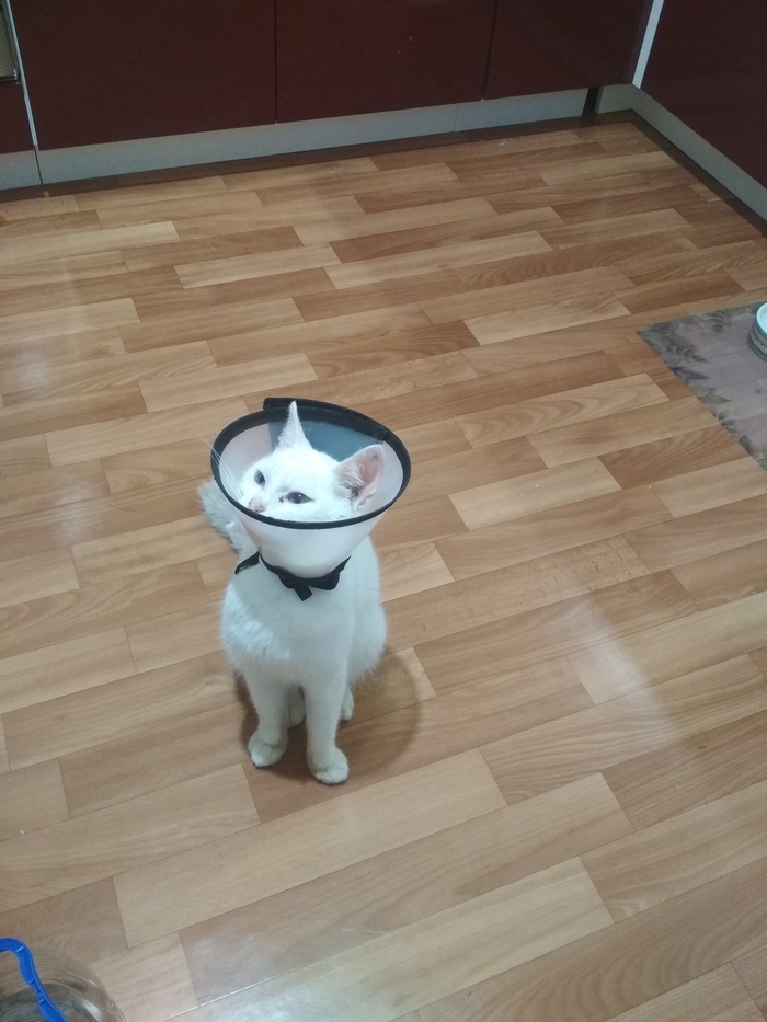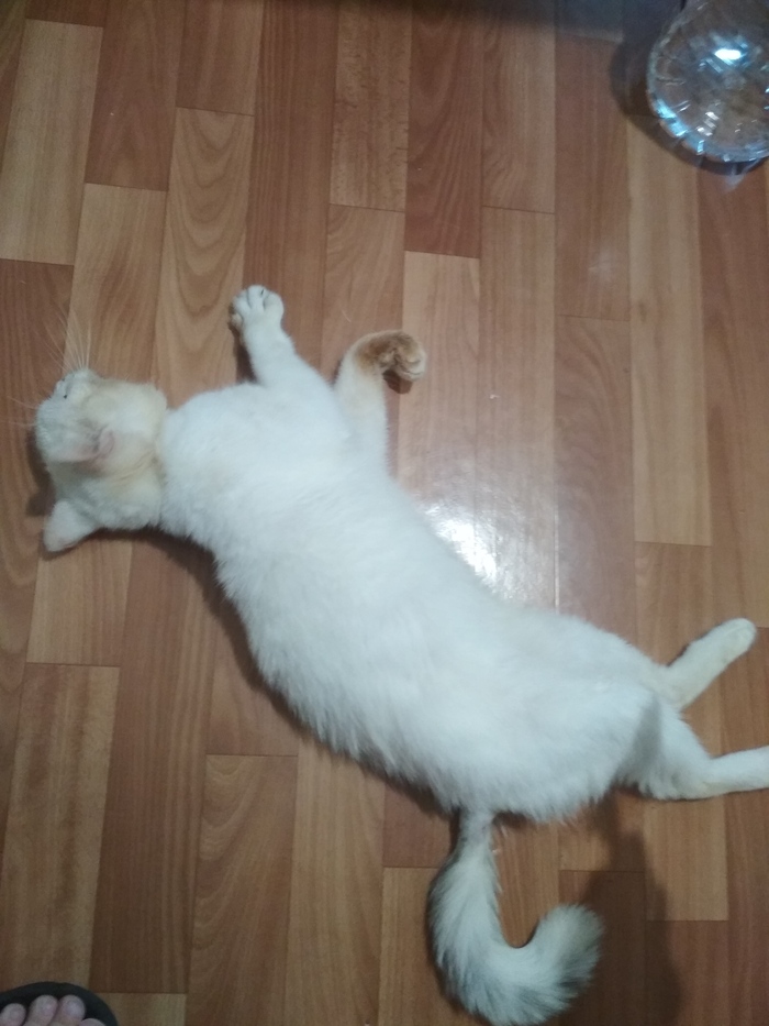 Пропили курс от глистов, уши обрабатываем от клещей. Обработали каплями от блох. В клинике сказали, что нет некоторых резцов, возможно били. Метис. Похож на сиамского только белый, с небольшими бежевыми пятнами на лапках и морде. Глаза голубые. Очень ласковый. Любит когда его гладят и чешут. В клинику спокойно ношу на руках. Сбежать даже не пытается.