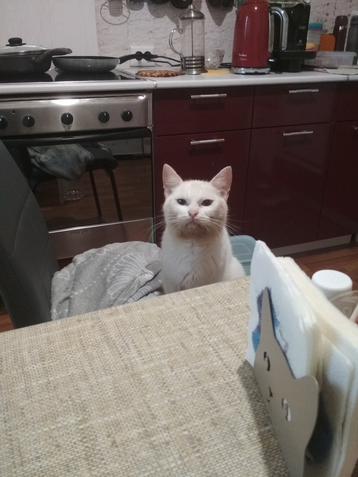 Делает вид, что всегда голодный. Когда заглядывает на стол, похож на кота из мема. Кормим пока пакетиками и сухим кормом. Но похоже, что ест абсолютно всё.