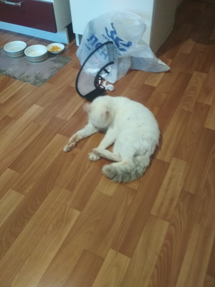 Отмыли от блох. В ветеринарке обработали рану, сказали, что покусали другие коты. Ранка на хвосте уже затянулась. В колпаке ходит пока не под присмотром. Вес набирает.