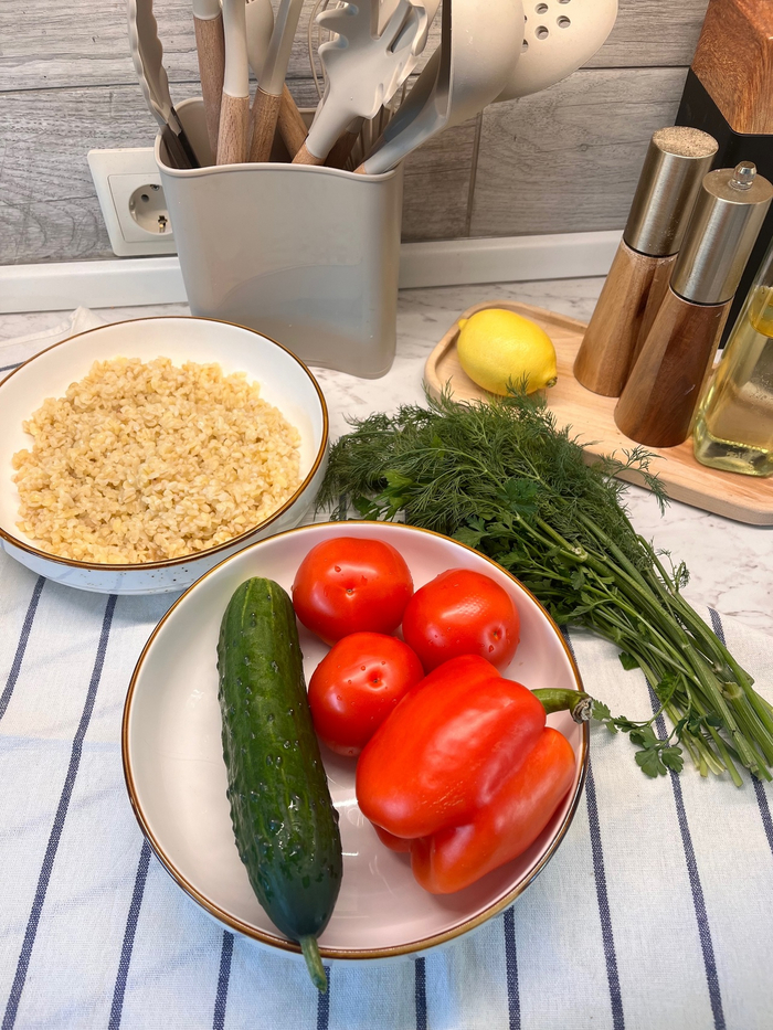 Овощи режем кубиками, зелень режем мелко и соединяем все с булгуром.