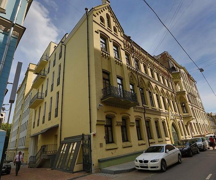 В 1897 г. архитектор Петр Павлович Щекотов выстроил красивый доходный дом в готическом стиле по заказу почетного гражданина Москвы Константина Федоровича Лазарева. Здание богато украшено портиками, резным декором, фигурными вставками, мозаикой, другими сложными архитектурными элементами и стилистически выделяется среди своих соседей