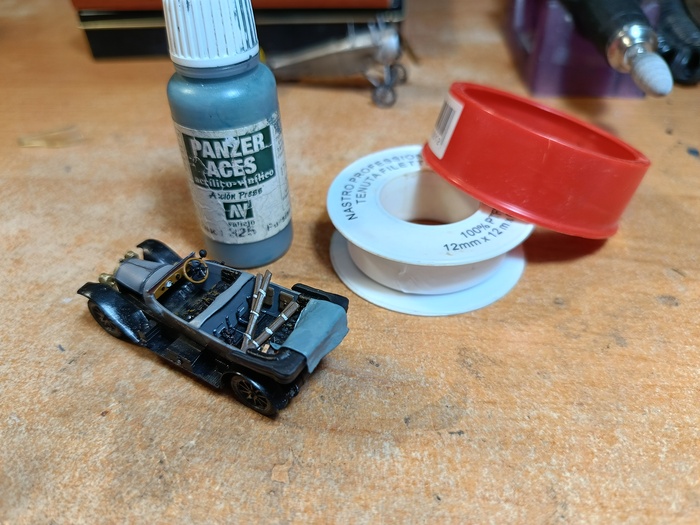 3. Полиэстеровая нить №240 тёмно-серого цвета производства Испании - одно из лучших модельных приобретений этого года. Из неё сделаны расчалки шасси биплана, её же закреплены на тележке консоли крыльев. Расчалки бипланной коробки, которые тоже должны быть, намотаны на катушки из деревянного шпона и расположены в кузовах автомобилей, рядом со стойками, пулемётом и запасной покрышкой колеса...