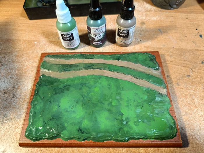 6. Далее займёмся ландшафтом и растительностью. Первым этапом окрасим высохшую текстурную пасту в базовые цвета почвы и зелени. Использовал акриловые краски Pacific, так как их не жалко. Ни на что более ответственное они всё равно не годятся.