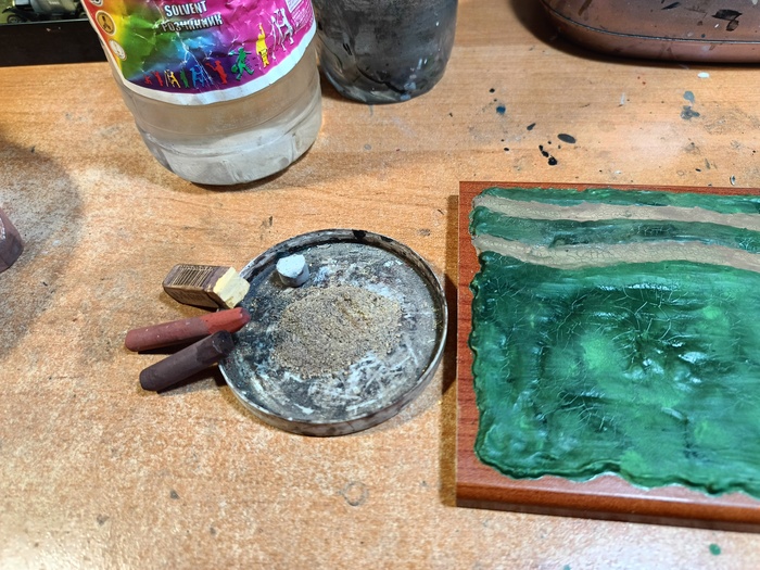 7. Рельеф грунтовой дороги формируется из толчёных пастельных мелков серого, песочного, бордового и цвета жжёной амбры. Порошок перемешивается, распределяется в нужных местах и фиксируется 646-м растворителем.