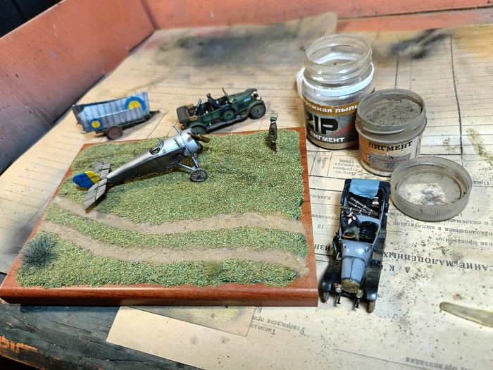 Приветствую, уважаемые подписчики, коллеги-моделисты и просто читатели! Ранее я рассказывал, как собирал автомобиль Vauxhall D-Type, ещё один автомобиль Benz 8/20 и биплан Nieuport 11c-1 Bebe со снятыми крыльями. Все они готовились для диорамы "Перші кроки до неба", которую я делаю на заказ. Сегодня будет последний, так сказать объединяющий этап работы - всякие мелочи полюс сама диорама. Обзора набора не будет, так как ни одного набора я не использовал, потому сразу перейдём к работе.