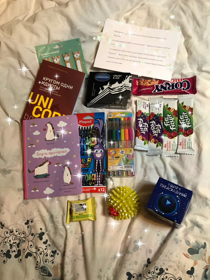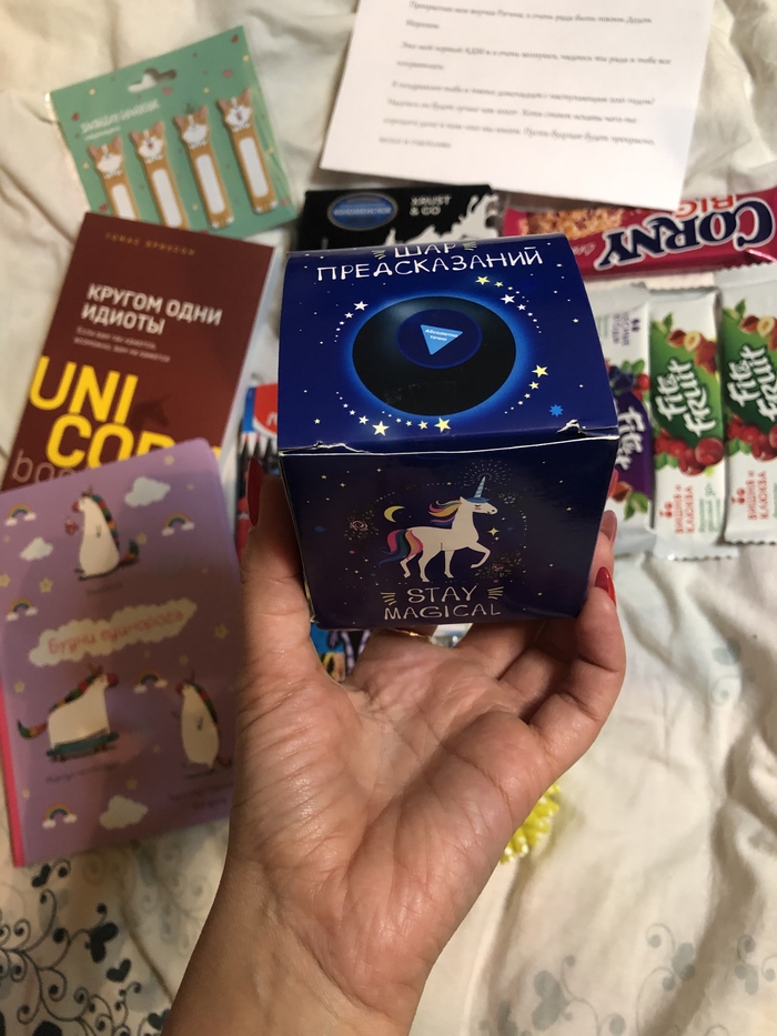 Для сына ручки, карандаши (очень любит рисовать), и ещё он сам себе присвоил шар предсказаний: