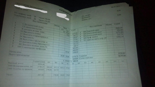 Вот квиток за апрель 2014 года моей мамы: около 8 тысяч на руки, с учетом того, что она выходила несколько раз не в свои смены.