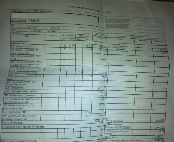 Вот квиток за август 2016, с учетом аванса: 9338 р. на руки, так же несколько раз выходила не в свои смены.