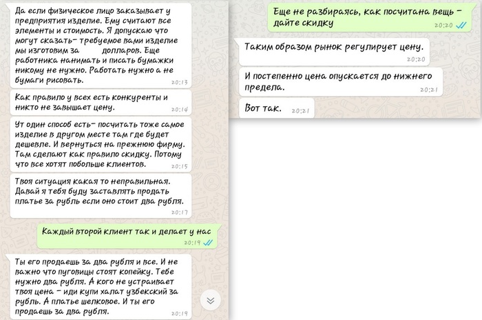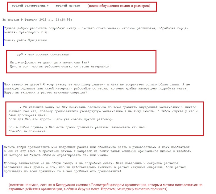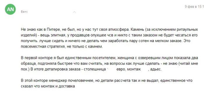 Это пример общения с менеджером одной фирмы. Была переписка еще с двумя, одни пообещали сбросить подробную смету во вторник (при этом несколько раз предупредили, что они находятся в РБ, видимо по моей локации видели, что пишу из Питера. Бедняжки, неужели им никогда не попадались заказчики, находящиеся в другом городе?), вторые пока молчат.