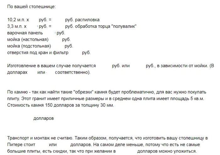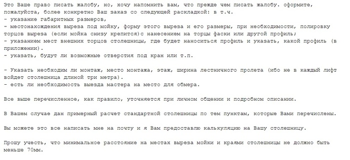 Осенью прошлого года уважаемый товарищ написал мне свою электронную почту, дабы задать мне пару вопросов и получить консультацию по гранитной/мраморной столешнице. Чем могли, помогли, мифы развеяли, на вопросы ответили, в общем, надеюсь, моя помощь пригодилась.