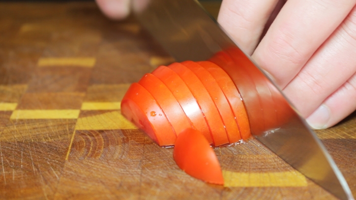 После говядины переходим к овощам. Картошку нарезаем крупным кубиком. Лук нарезаем как вам будет удобно. Я предпочитаю нарезать его полукольцами. Помидоры мне больше всего нравится нарезать полу кружками. Болгарский перец необходимо нарезать квадратиками. Зубчики из одной головки чеснока нарезаем произвольно, некрупно.