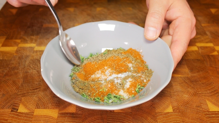 Приготовим смесь специй. Для этого в глубокой миске смешиваем 4 ч.л. соли, 2 ч.л. паприки, 2 ч.л. молотого кориандра, добавляем 1 ч.л. свежемолотого черного перца. С веточек тимьяна снимаем листики, их также добавляем к специям. Перемешиваем всё вместе.