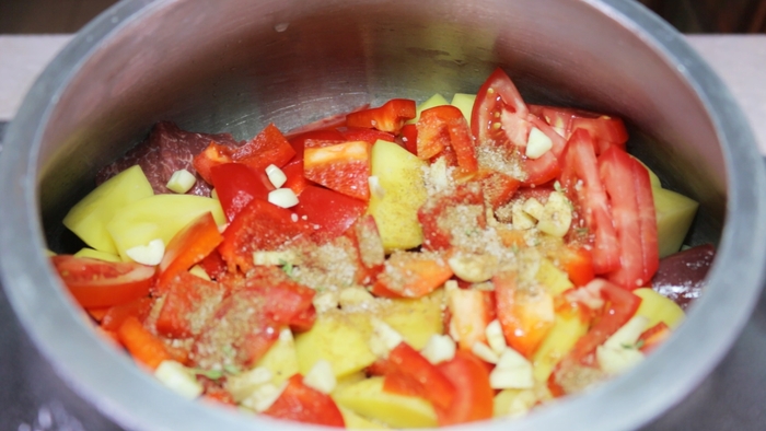 Закладываем ингредиенты в афганский казан слоями. На дно казана выкладываем половину лука. Сверху лука половину говядины. Затем половину картошки и болгарских перцев с помидорами. Добавляем половину порезанного чеснока и присыпаем половиной смеси специй. Закладываем оставшиеся ингредиенты в казан в той же последовательности.