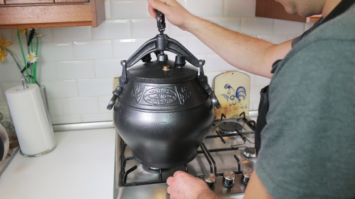 Закрываем казан крышкой и фиксируем её. Ставим казан на плиту, на сильный огонь. Когда казан начнёт шипеть, уменьшаем огонь до среднего и оставляем готовиться мясо с овощами на 1 час.