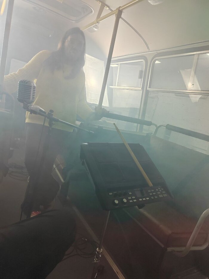 Сначала снимали в автобусе – очень долго развешивали хромакей, растыкивали свет... Руководил всем наш ударник Андрей – у него есть некоторый опыт в съёмке и монтаже. Помогала моя жена Ксюша. Она вешала хромакей, держала свет, даже сняла несколько кадров. И в целом вдохновляла и поддерживала