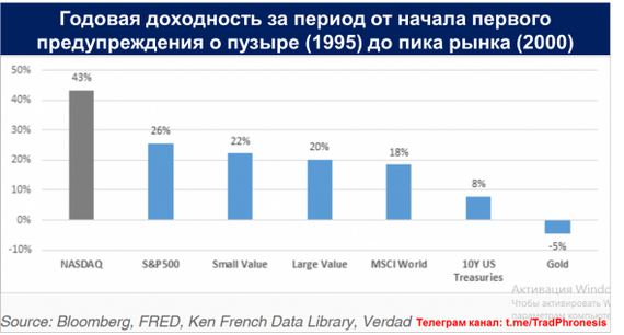 Далио, Линч, Маркс (Говард), Сорос и Баффет — все они заметили пузырь и предупредили инвесторов об опасности. Но их предвидение пришло слишком рано. На рисунке вы можете увидеть среднегодовую доходность рыночных инструментов от первых предупреждений о пузыре до пика рынка в марте 2000. (Телеграм канал: t.me/TradPhronesis)