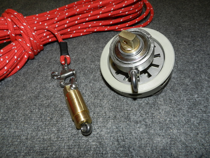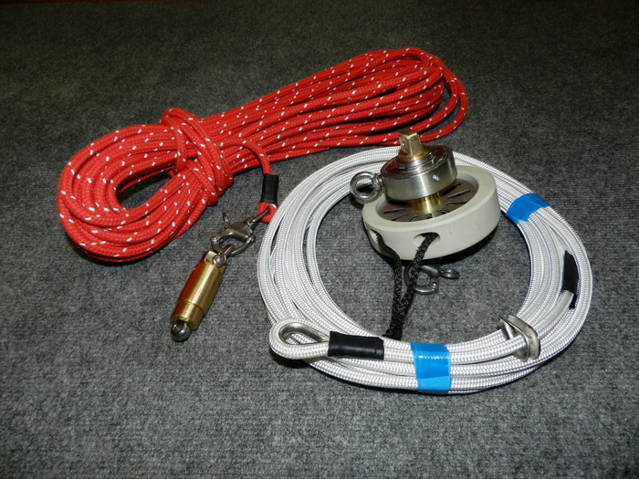 Белая веревка - это нескручивающийся (т.н. антиторсионный) трос, который заказывался отдельно. Так же на мачте был установлен блок для генакер-фала (веревки, которой парус поднимается)