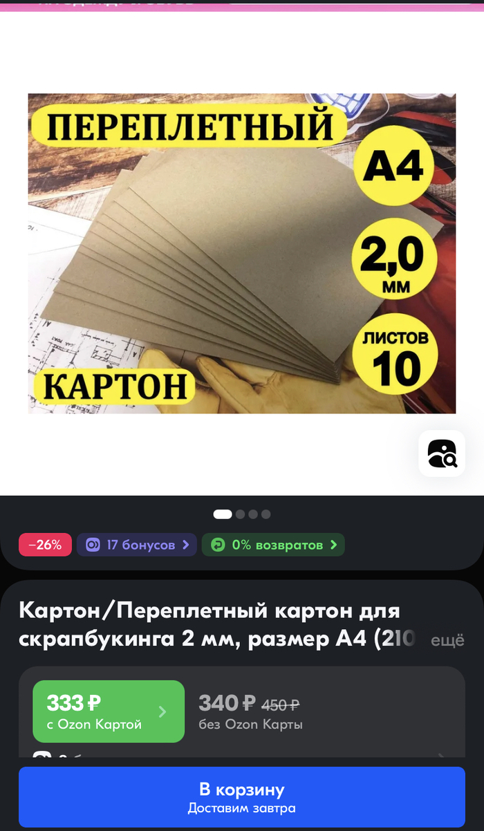 Переплетный картон продается на всех площадках за сущие копейки в разных форматах.