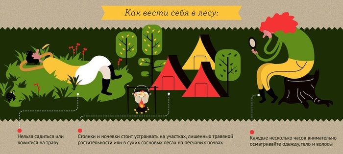 - избегайте участков леса с густой растительностью, не садитесь и не ложитесь на траву. -Стоянки и ночёвки устраивайте в местах, лишённых травы или в сухих сосновых лесах на песке;