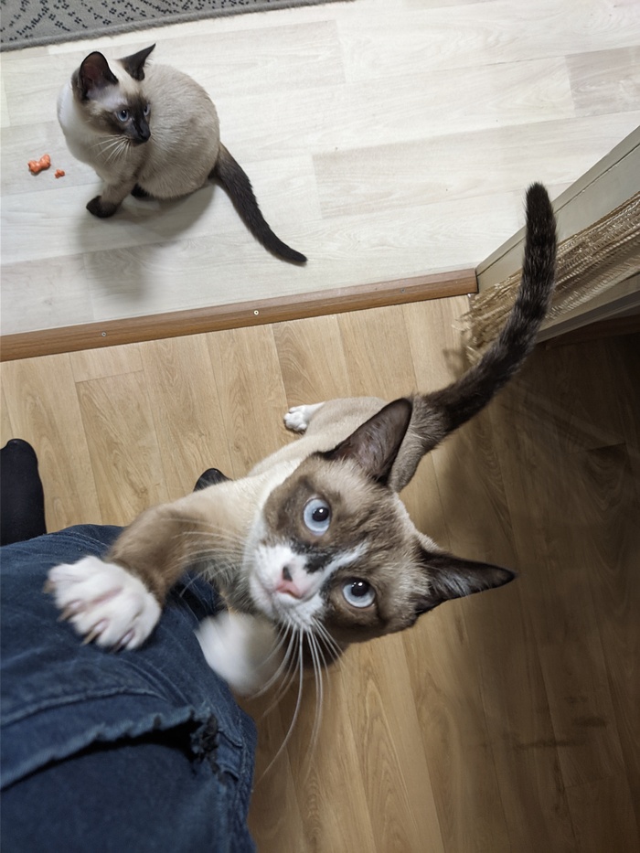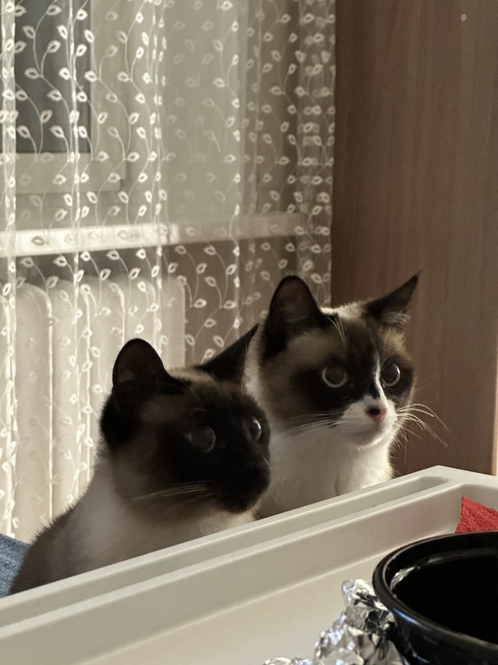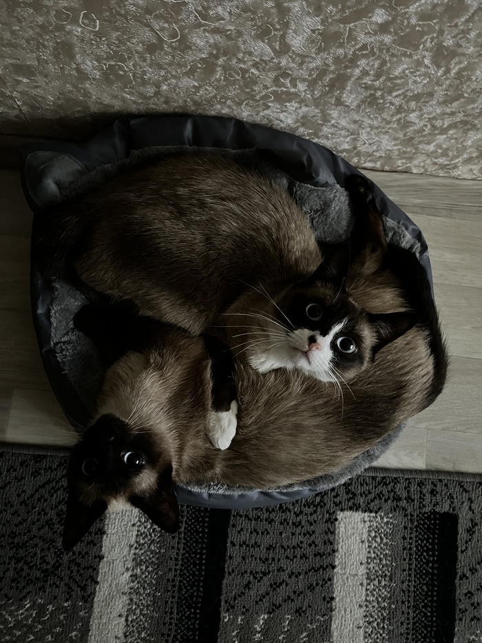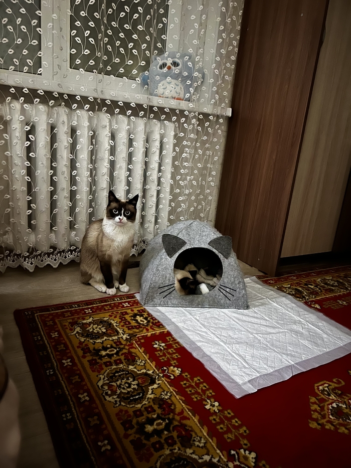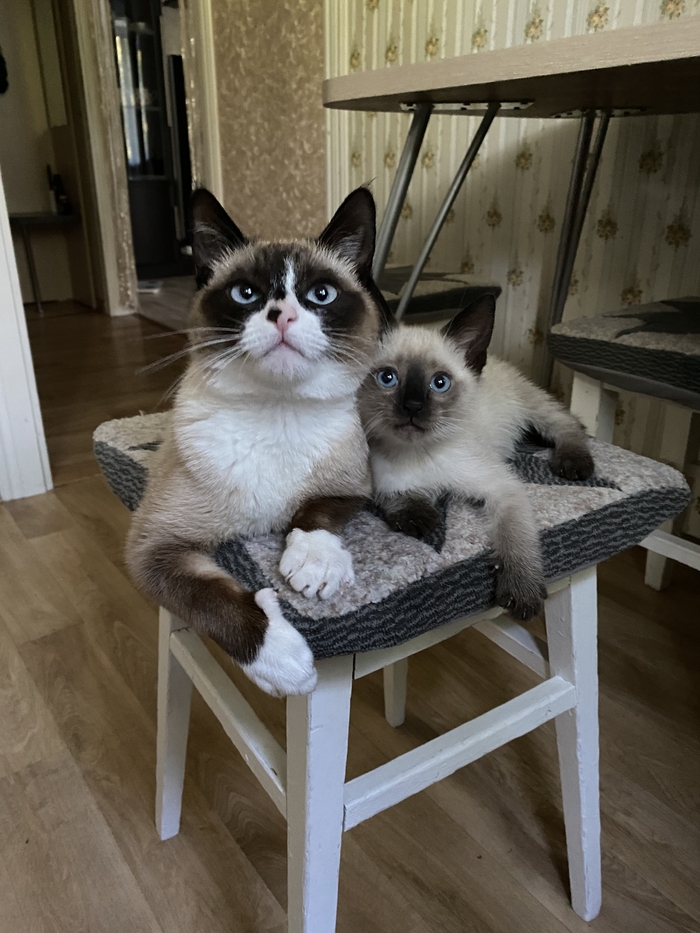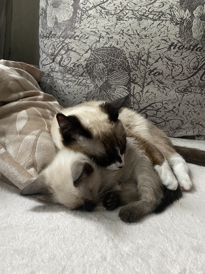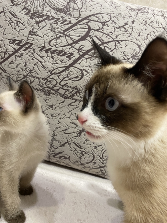 Это уже больше похожая на сиамскую кошку . Мику на тот момент было уже полгода а кошке всего 2,5 месяца и мы переживали как он отреагирует на нового друга в квартире .