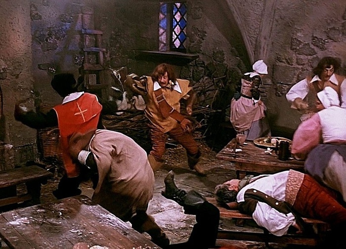 Наконец приехал Веня Смехов и можно было снимать драку в «Красной голубятне» и в «Таверне». После выхода Атоса от Миледи и выстрела в бокал отравы д’Артаньяна Веня принимает бой на лестнице с двумя гвардейцами. Ему поможет д’Артаньян, но…немного позже. Во фронт на Портоса, Арамиса и д’Артаньяна нападают, обнажив шпаги семеро гвардейцев. Арамис выбегает, протыкая своей шпагой одного за другим гвардейцев у камина с висящей тушей барана. По замыслу в неё вонзится шпага гвардейца, отбитая Арамисом.