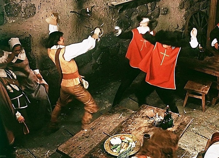 Драка в «Красной голубятне» была самой сложной по накалу, трюкам и раскрытию характеров мушкетёров. Именно здесь нужно было придумать скупое, экономичное фехтование прожжённого бойца Атоса,