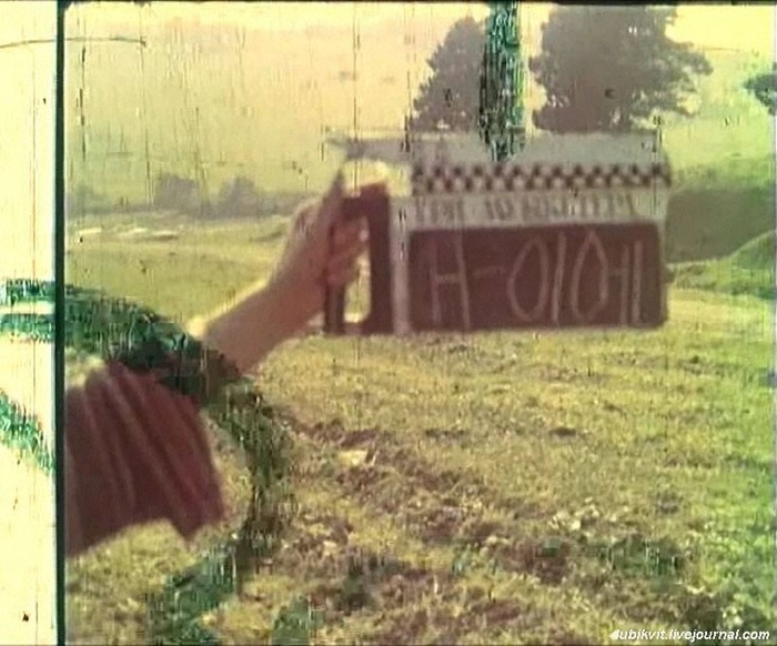 Хлопушка кадра проскачки Четырёх мушкетёров в Лондон. Буква "Н" на хлопушке означает немой дубль, то есть изображение снимается без звука. Монтажёр понимает, что плёнку со звуком подкладывать при черновом монтаже не нужно. Львов. 1978 год