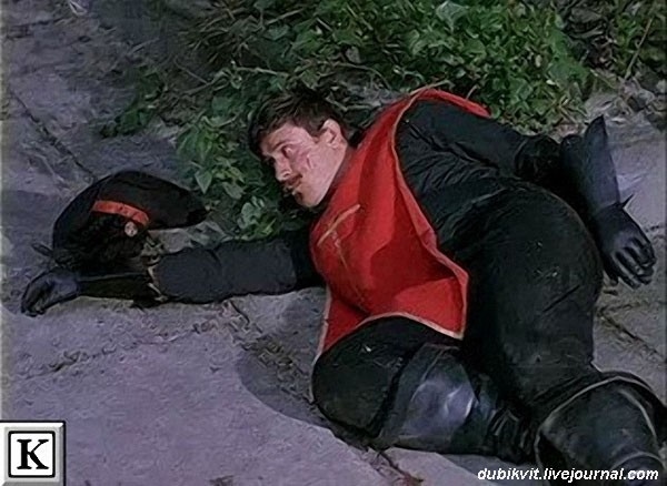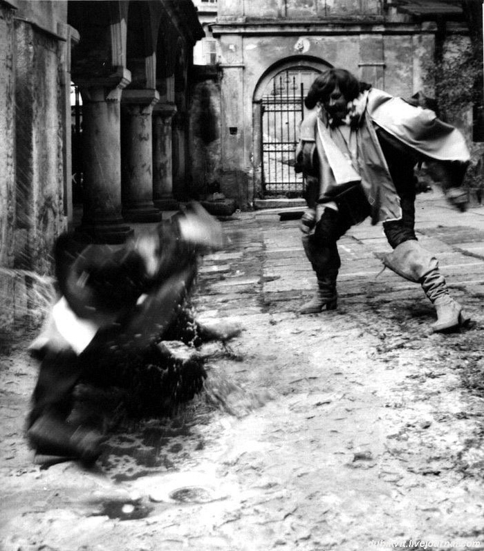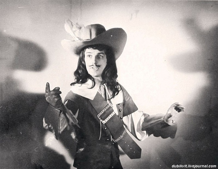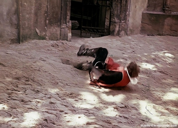 Александр Абдулов в образе гвардейца, уложенного Арамисом последним ударом локтя, во время исполнения песни. Идея Георгия Эмильевича Юнгвальд-Хилькевича. Львов. 1978 год