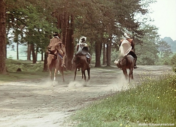 Собственно оставалась проскачка д’Артаньяна и Атоса вдоль дороги на хорошем галопе. Мише Боярскому Лариса привела своим ходом его Хасхана, а Вене Смехову подвели того зверя, который тремя часами раньше ссадил меня. Хилл отверг наши опасения, оправдывая риск, необходимостью крупных планов скачущих мушкетёров. В этой проскачке крупный план с движения было бы и не снять. Хилькевич, видимо, просто хотел показать Вене, что деньги он платит ему не зря.