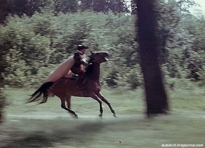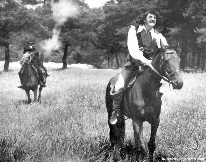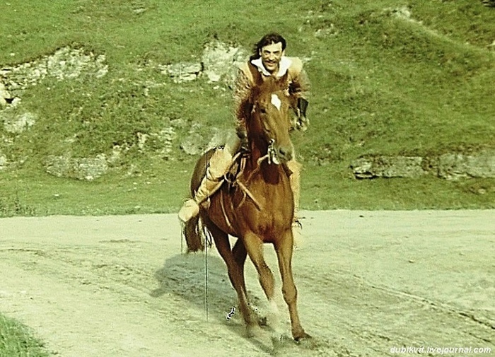Мотор! Кони застригли ушами. Веня плохо держал повод, смутно понимая что с ним делать, кроме как висеть на нём в случае падения. Камера! Начали! Кони рванули быстрее снарядов легендарной «Катюши». Наверное они подумали, что это Олимпийские игры. Боярский сидел откинувшись назад, легко компенсируя толчки и без того гладкого галопа Хасхана.