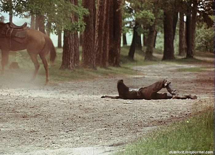 Прогнав их пару раз в гору, мы сняли проскачки и падение гвардейца. Упал Толя очень не удачно, получив сильный ушиб бедра и раскритиковав меня, как постановщика конных трюков.