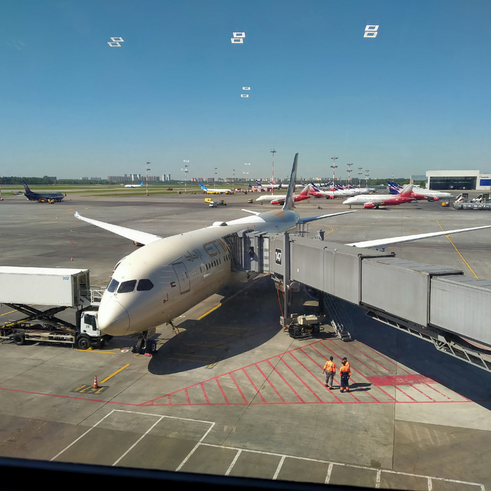 Мы прибыли в Шереметьево, приблизительно в ~8.30-9 утра за пару часов до вылета. У стойки регистрации "Этихад" не было никого. Сдали багаж, уточнили, что получаем его уже сразу в Нарите и отправились на паспортный контроль. Забавно, что при досмотре заставляют избавляться от всей воды, выливать и выкидывать ее. На этот счет не стоит беспокоиться - можно снова пополнить бутылки уже в транзитной зоне в бесплатных кулерах с водой.