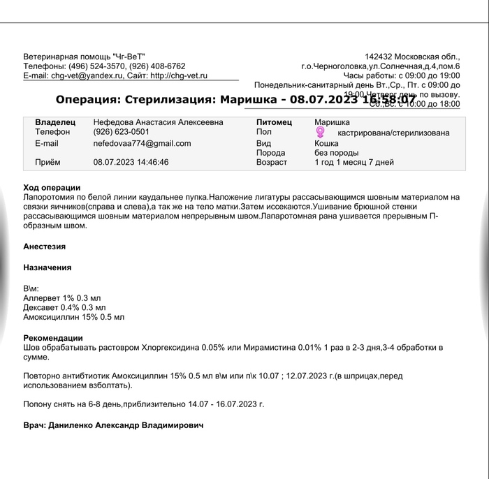 Чеки прилагаю) правда она отмечена как Маришка, но сегодня мы с Оксаной (которая оплатила стерилизацию и кормила её все это время, как она появилась в нашем районе) поняли, что она Матрешка))