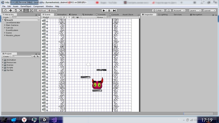 Поставив себе цель сделать для начала прототип Doodle Jump, я принялся за дело. Спустя неделю все было готово. Нарисовал простенькую графику и запилил полную механику. Однако она казалась настолько простой и скучной. Так что было принято решение улучшить, что есть (а вообще, это жена мне подсказала, что в ЭТО никто сейчас играть не будет)!