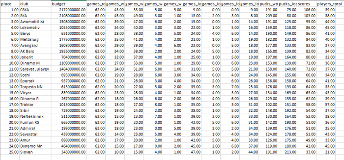 Для начала, я взял 25 команд КХЛ и разместил их соответсвенно количеству набранных очков в сезоне 2018-2019 (сами понимаете, 2019-2020 выдался каким-то никаким). К общей статистике, были также добавлены бюджеты и количество игроков в каждой команде. Статистику по клубу я взял с сайта КХЛ (место, выигрыш, проигрыш, игр сыграно и т.д.). С бюджетами пришлось подзаморочиться. Их я взял с championat.com вот тут и тут.