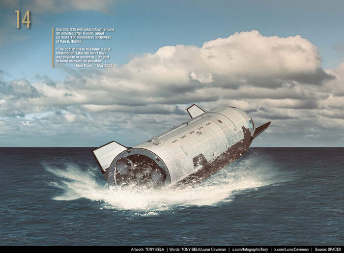 Иллюстратор Тони Бела из Австралии большой поклонник американской космонавтики. И особенно Илона Маска. Очередная инфографика к предстоящему второму тестовому полету Starship. С отражением модернизации проекта - показано "горячее разделение" ступеней. Хочется напомнить, что это "воспоминание из будущего".
