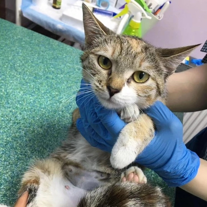 Привезли на стерилизацию, чтобы она хотя бы бесконечно не рожала котят на погибель. Хотели вернуть обратно, но малышка оказалась контактной..