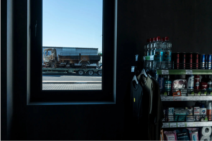 На заправке, последней крупной придорожной остановке перед линией фронта на Украине, до которой было 50 миль, царило оживление. Солдаты теснились рядом с мирными жителями, а кассиры выкрикивали номера заказов, перекладывая хот-доги через прилавок. На экранах отображались пожертвования в пользу армии, которые делали на заправке, и цифра росла с каждой секундой. Снаружи подъехали пикапы, покрытые камуфляжной краской, и прогрохотал грузовик с ракетной установкой на платформе.