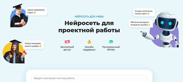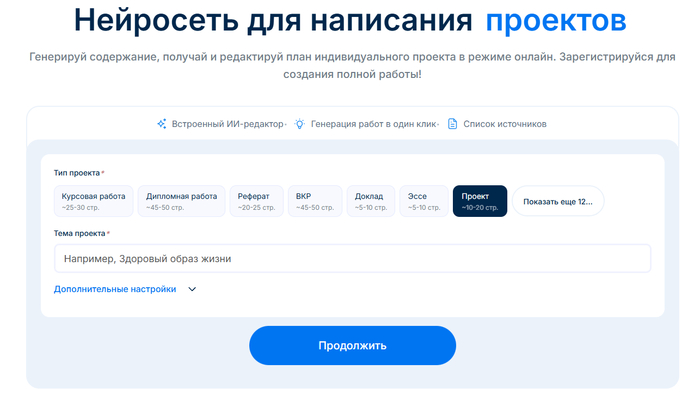 Протестируйте нейросеть для вашего проекта: введите тему работы и убедитесь, как рутинные задачи исчезают, оценки становятся выше, а дедлайны уже не вызывают страха.