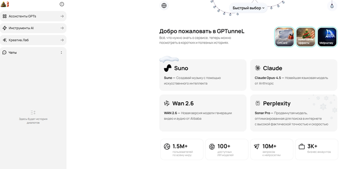 Сервис-агрегатор нейросетей, которая собирает более 100 ИИ‑моделей для работы с текстом, изображениями, видео, аудио и музыкой в одном интерфейсе без отдельных подписок на каждый инструмент. Вы сможете выбрать нужную нейросеть напрямую из каталога, пополнить баланс и оплачивать запросы по факту их выполнения, а не по фиксированным планам, что обеспечивает гибкость расходов. В GPTunneL можно генерировать тексты, визуальный контент, видеоролики, озвучку, музыку и заниматься аналитикой данных, а также создавать чат‑ботов и интегрировать API‑решения в рабочие процессы. Платформа подходит для бизнеса, фриланс‑проектов, обучения и творческих задач.