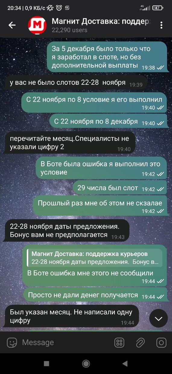 Доброго времени суток, господа. Случилась неприятная ситуация. Работал курьером сети "Магнит", попался на глаза в боте приятный бонус "Выполни 11 заказов в городе Омск с 22 по 8 ноября включительно и получи 2700р. дополнительно" (Нет, это не ошибка в моем написании, цитирую как есть). Выполнил 12 заказов 29-го ноября.
