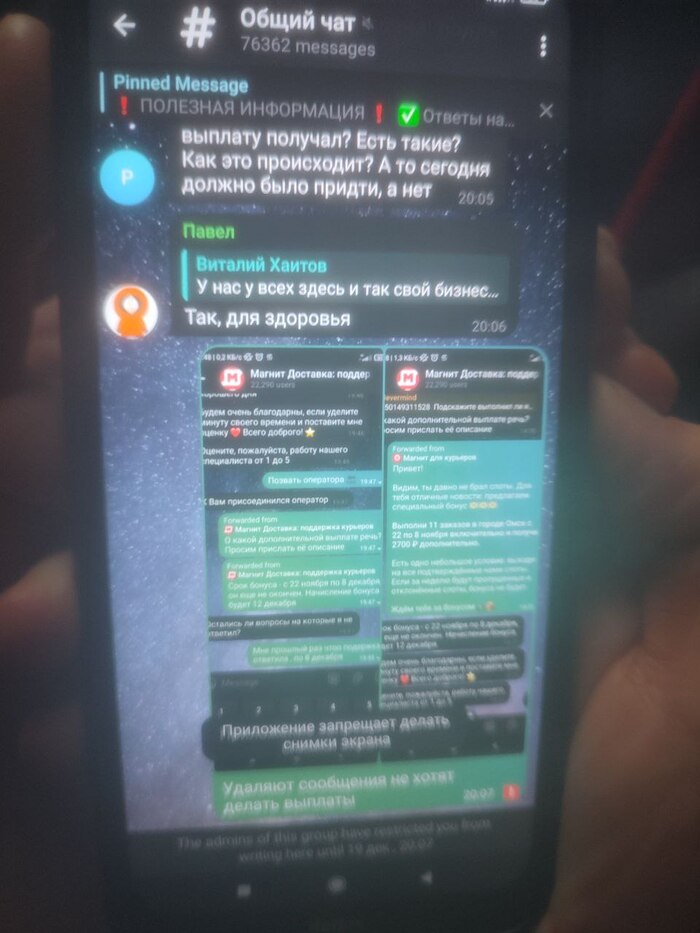 Далее ситуация развивалась так: меня не устроил ответ поддержки, что они "ошиблись" в датах (дважды: в боте и первоначальном ответе тех. поддержки после моего уточнения), решил скинуть скрины переписки в общий чат Магнита по России и меня забанили через 1.5 минуты на неделю.